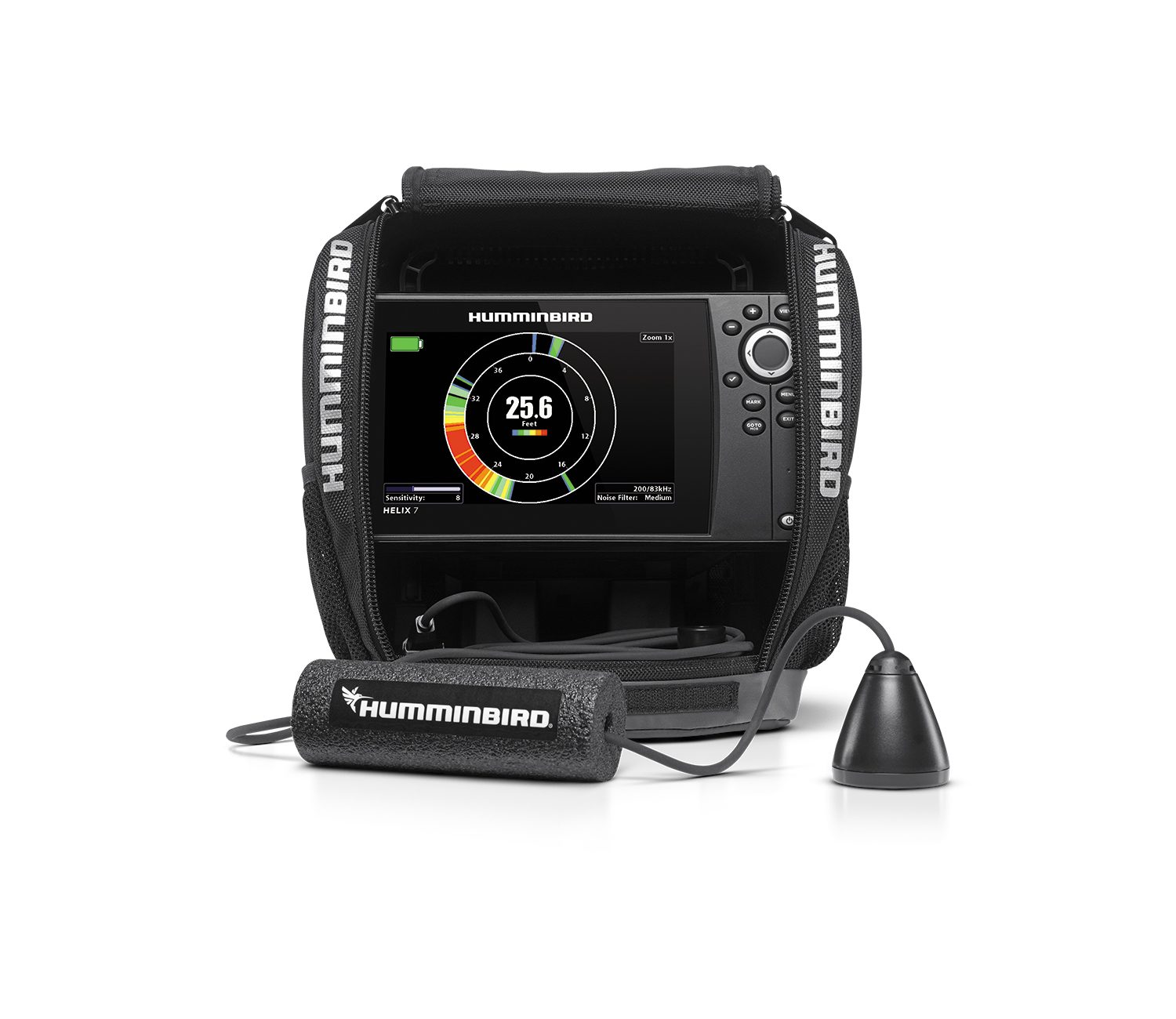 Humminbirds Dual Beam issensor er inkluderet i pakken og fungerer sammen med alle ekkolod, der understøtter 83/200 kHz frekvenser. Sensoren har en flydende krop rundt om kablet, som gør det nemt at justere sensorens position til isens underkant.